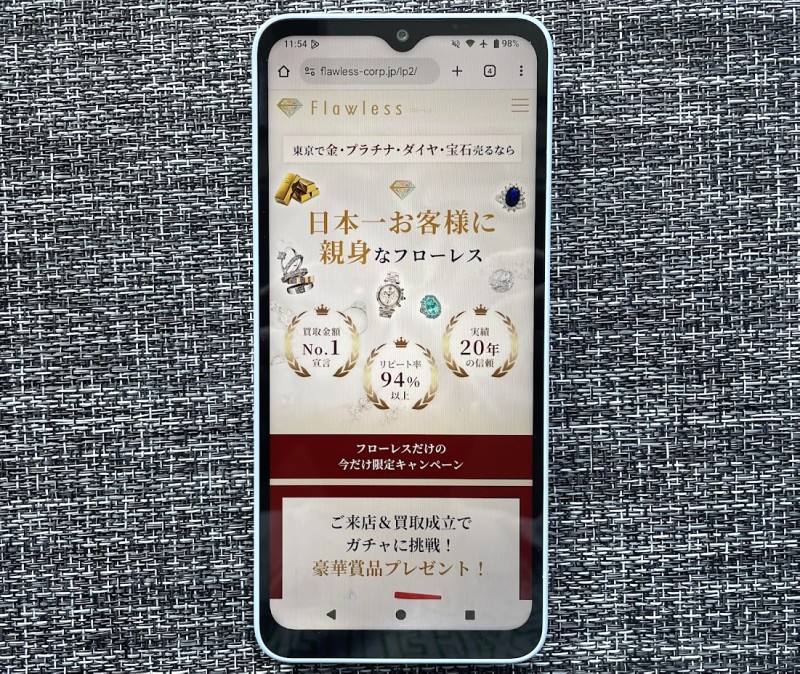 フローレスは、金・貴金属の買取において、全国どこでも宅配買取に対応し、これまで20万点以上の宅配買取実績があります。査定は無料で、最短60秒のスピード査定を掲げています。買取成立後は、非対面の場合「14時までに成立→24時間以内に振込」としており、店舗買取なら即日手渡し(手渡しは200万円が上限)にも対応しています。