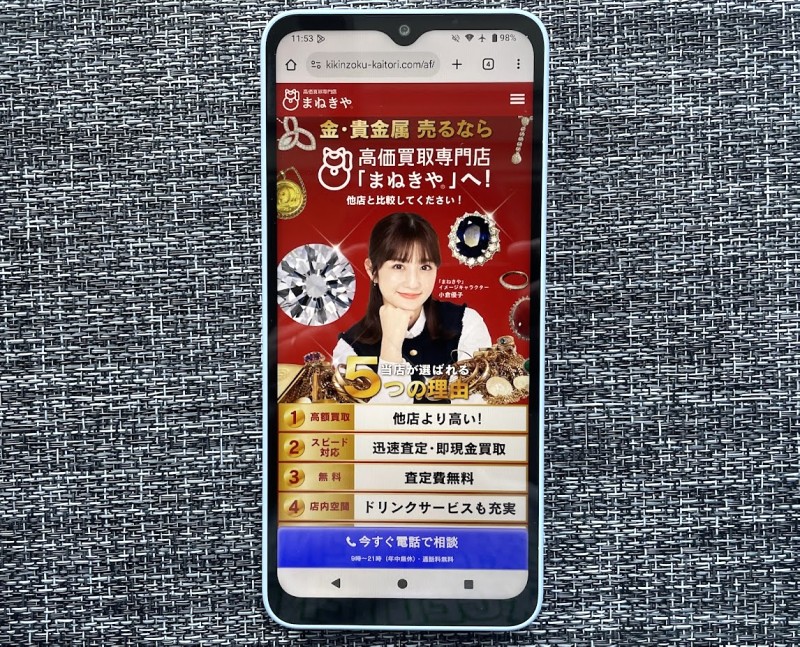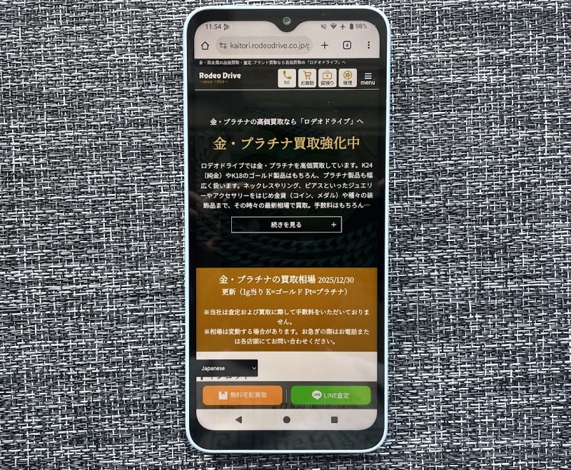 金の査定は、相場×重量×純度(品位)をベースにしつつ、実際の買取額は品物の状態や付属品の有無などでも変動する前提で、金製品のコンディションまで見て価格を提示する方針です。電話で相場とおおよその買取額を事前に聞ける導線もあります。