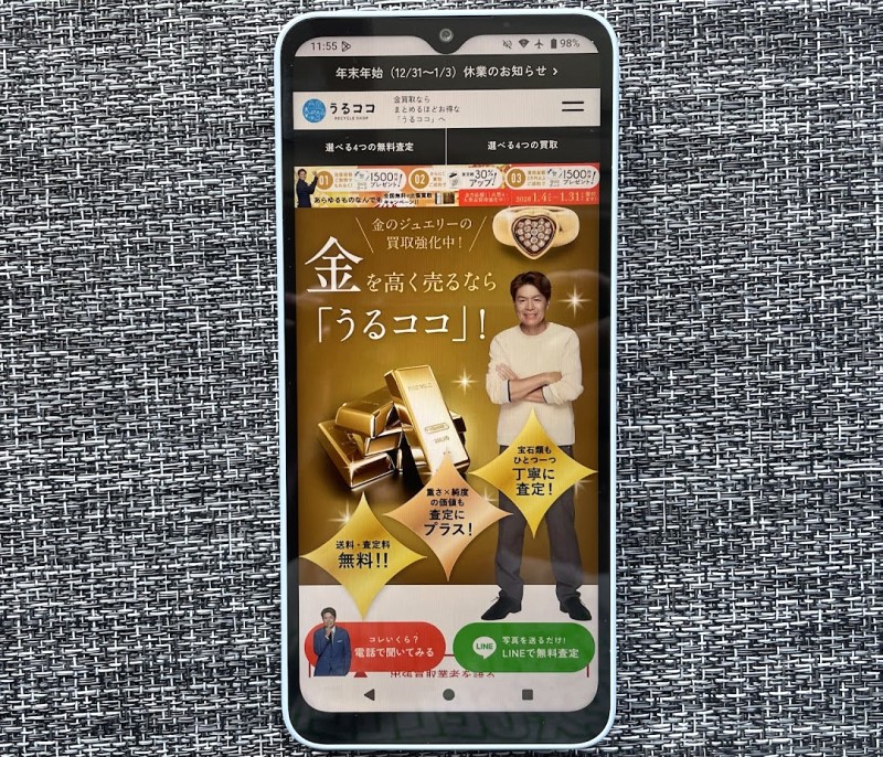 うるココは、金・貴金属の買取に対応し、出張・宅配・店頭の買取方法を用意。手数料は基本的にかからず、出張は全国無料(離島除く)で相談できます。